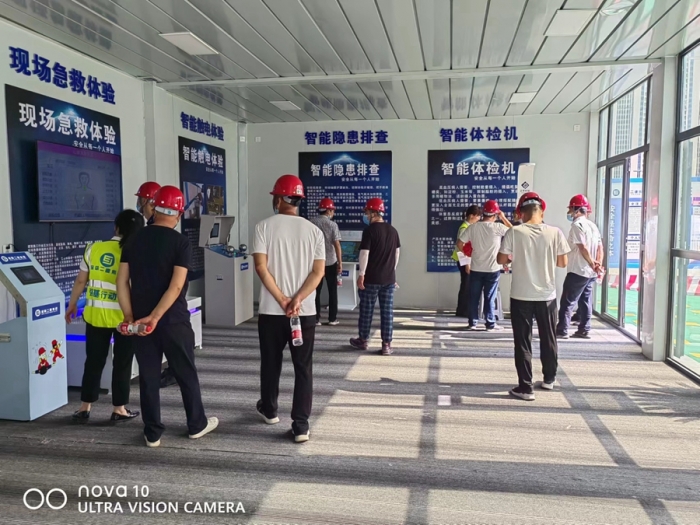 碧桂園鳳凰城三期項目由六棟高層住宅樓、配套商業(yè)及地下車庫組成,總建筑面積為 115340㎡,主體施工采用附著式全鋼爬架+新型鋁合金模板等施工工藝。該項目工序穿插作業(yè)多、群塔作業(yè)等安全管理協(xié)調(diào)難度大,項目積極采用群塔防碰撞系統(tǒng)、塔吊智能監(jiān)測系統(tǒng)、塔吊防松動預(yù)警螺母及塔吊吊鉤可視化系統(tǒng)。觀摩會現(xiàn)場中,通過智慧工地云平臺、安全管理指揮中心、VR安全教育體驗館等全面展示了項目施工現(xiàn)場智慧工地和文明施工管理現(xiàn)代化模式。